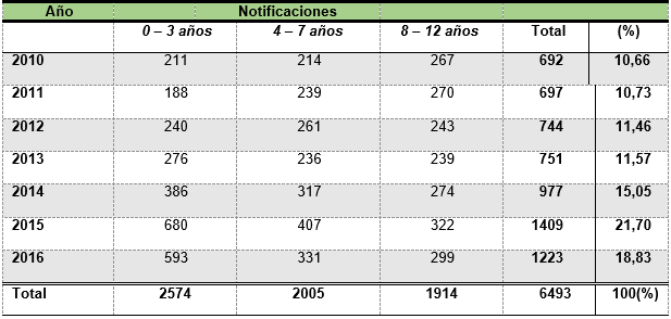 Se registraron 6.493 notificaciones de violencia contra niños de 0 a 12 años incompletos: 10,66% en el año 2010; 10,73% en 2011; 11,46% en 2012; 11,57% en 2013; 15,05% en 2014; 21,70% en 2015 y 18,83% en 2016 (Tabla 1).