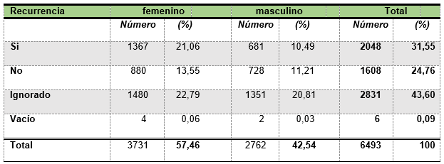 La recurrencia de violencia estuvo presente en 31,55% de los casos; 24,76% no presentó recurrencia, 43,60% fue campo ignorado y 0,09% fue campo vacío. Del total de casos notificados recurrentes, 21,05% fueron contra sexo femenino y 10,49% contra sexo masculino (Tabla 10).