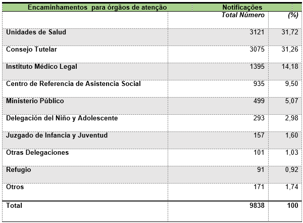 Los casos de violencia fueron encaminados en la ciudad de Porto Alegre, para el sector salud (31,72%), Consejo Tutelar (31,26%), Instituto Médico Legal (14,18%), Centro de Referencia de Asistencia Social (9,50%), Ministerio Público (5,07%), Delegación del Niño y Adolescente (2,98%), Juzgado de la Infancia y Juventud (1,60%), otras delegaciones (1,03%), refugio (0,92%) y otros (1,74%) (Tabla 11).