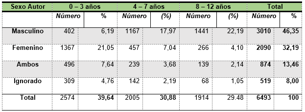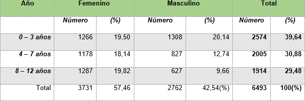 De los 6.493 casos notificados: 57,46% fueron de sexo femenino y 42,54% de sexo masculino; el grupo etario que obtuvo más notificaciones fue el de 0 a 3 años (39,64%), seguido del de 4 a 7 años (30,88%) y 8 a 12 años (29,48). Hubo una distribución regular de las notificaciones entre grupos etarios del sexo femenino; sin embargo, con una ligera predominancia entre 8 a 12 años incompletos (19,82%). En el sexo masculino, existió más notificaciones entre 0 a 3 años (20,14%) y decreció considerablemente a medida que la edad aumentaba. (Tabla 2).