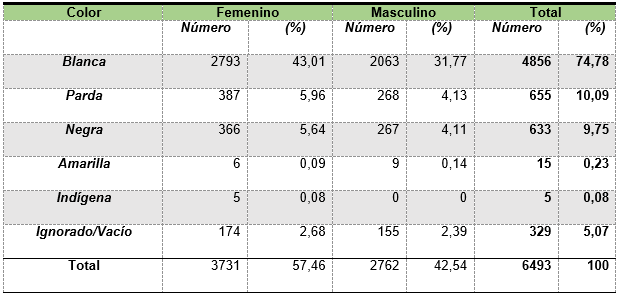 El color de piel blanca obtuvo mayor prevalencia en las notificaciones de violencia (74,78%), seguida de la parda (10,09%), negra (9,75%), ignorado/vacío (5,07%), amarilla (0,23%), indígena (0,08%) (Tabla 3).