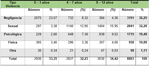 Se encontraron 8.803 notificaciones con relación al tipo de violencia, número superior al de casos de violencia encontrados, debido a que algunos niños sufrieron más de un tipo de violencia en el relato de las notificaciones. Los tipos de violencia más prevalentes fueron: negligencia (36,25%), sexual (32,28%), psicológica (19,48%), física (10,88%) y otros (1,11%) (Tabla 4).