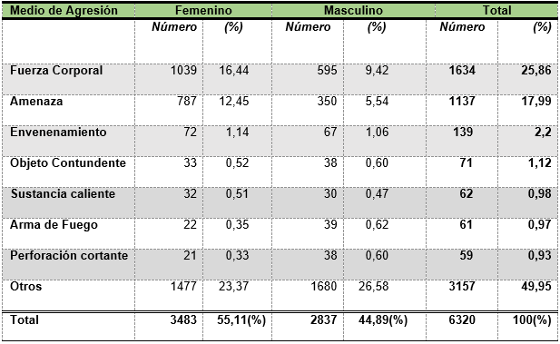 En este estudio se pudo constatar notificaciones de 6.320 medios de agresión, siendo la más prevalente la fuerza corporal (25,86%), seguida de la amenaza (17,99%), envenenamiento (2,2%), objeto contundente (1,12%), sustancia caliente (0,98%), arma de fuego (0,97%), perforación cortante (0,93%), otros (49,95%) (Tabla 5).