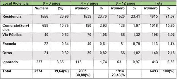 El principal local de ocurrencia de la violencia fue la propia residencia del niño (71,07%), seguido de comercios/servicios (15,65%), vía pública (3,02%), escuela (1,74%), otros (2,16%), ignorado (6,36%) (Tabla 6).