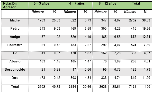 En cuanto a la relación de la víctima con su agresor, fueron contabilizados 7.124 agresores en las notificaciones, dado que en algunos casos existió más de un agresor por víctima. La madre, independientemente del grupo etario, fue la mayor responsable de las violencias (38,63%), seguida por el padre (19,86%), amigo (12,24%), padrastro (7,36%), tío (4,67%), abuelo (4,01%), desconocido (1,73%), otros (11,50%) (Tabla 7).