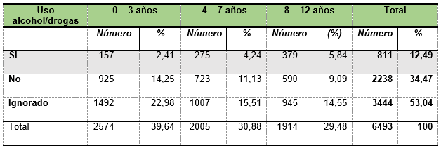 El uso de alcohol/drogas constó como ignorado en 53,04% de las notificaciones, seguido por el no uso (34,47%) y uso (12,49%) (Tabla 9).