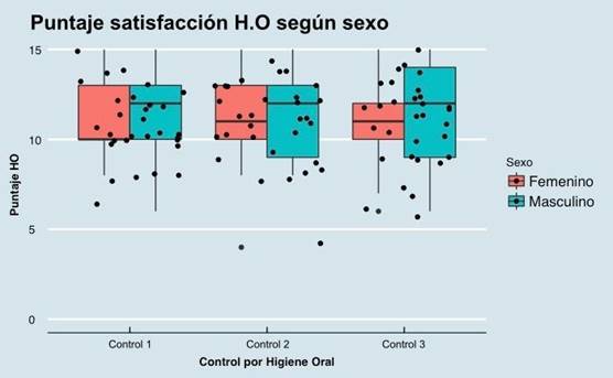 En el componente de la dimensión higiene oral (H.O), la media obtenida por las mujeres fue de 11 (DE ± 2,3) puntos para el primer control, 11 (DE ± 2,5) puntos para el segundo control y de 11 (DE ± 2,2) puntos para el tercero. En cuanto a los hombres, la media obtenida fue de 11 (DE ± 2,5) puntos para el primer control, 11(DE ± 2,5) para el segundo y 12 (DE ± 3,0) para el tercero (Fig. 1).
