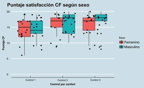 Los puntajes obtenidos para la dimensión de confort (CF) se observan en la Fig. 2. La media para las mujeres en el primer control fue de 15 (DE ± 3,4) puntos, 16 (DE ± 2,8) puntos para el segundo, y 16 (DE ± 2,9) para el tercero. Para los hombres la media de los resultados fue 14 (DE ± 3,8) puntos para el primer control, 17 (DE ± 3,5) puntos para el segundo y 17 (DE ± 4,1) puntos para el tercero.