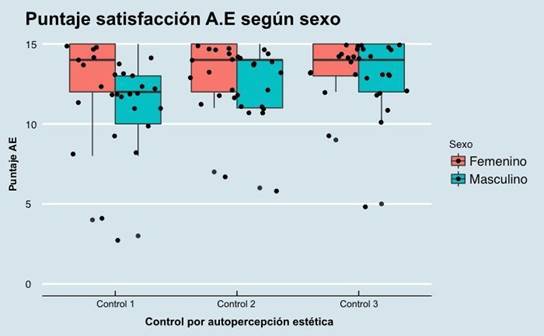 Para la dimensión de autopercepción estética (A.E), los puntajes obtenidos se muestran en la Fig. 3. La media para mujeres en el primer control fue de 13 (DE ± 2,7) puntos, 13 (DE ± 2,0) puntos para el segundo y 14 (DE ± 1,5) puntos para el tercero. Para hombres, la media en el primer control fue de 11 (DE ± 3,4) puntos, 13 (DE ± 2,5) puntos para el segundo y 13 (DE ± 2,9) puntos para el tercero.