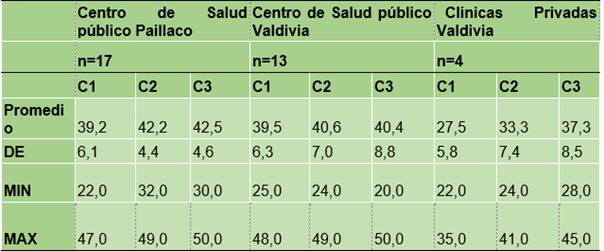 Se realizó un análisis de estadística descriptiva mediante medidas de tendencia central y dispersión. La prueba de Shapiro Wilk se realizó para determinar normalidad de los datos. Para establecer diferencias entre puntajes y los diferentes centros de salud, se realizó la prueba de Friedman con un nivel de significancia p<0,05. Para esto fue utilizando el programa estadístico de libre acceso R versión 3.4.1.