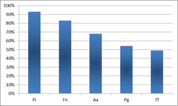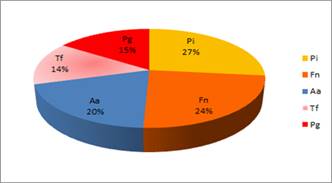 El microorganismo que apareció en mayor proporción fue P. intermedia, seguido de F. nucleatum. El tercer lugar correspondió a A. actinomycetemcomitans representando el 20%.