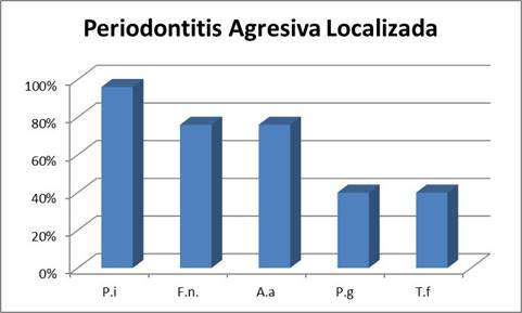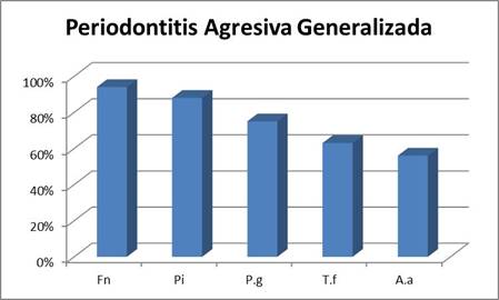Los microorganismos presentes en la Periodontitis Agresiva Generalizada (PAG) en nuestro estudio son similares a los encontrados en los cuadros de Periodontitis Agresiva en otros países 15-16. De acuerdo a la bibliografía, los microorganismos que suelen detectarse en los cuadros de PAG son P. gingivalis, A. actinomycetemcomitans y T. forsythia16.