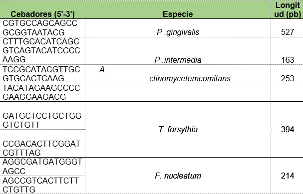 Para el diseño de los cebadores se utilizó la base de datos NCBI (National Center of Biotechnology Information) con la finalidad de buscar y seleccionar las secuencias del 16S ARNr, como blanco en el diseño de los cebadores específicos para T. forsythia (GenBank: AP013045.1) y F. nucleatum (GenBank: MH078456.1). Asimismo, se utilizó información bibliográfica donde se realizaron estudios con oligonucleótidos validados para la especie 19.