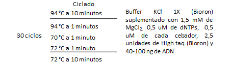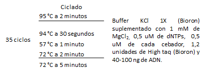 La visualización de los resultados de las amplificaciones (bandas) se realizaron en geles de agarosa al 1.2%, buffer TBE (Tris-borato-EDTA) 0.5x, 5µl de GoodView, 2µl de cyan/orangeloading buffer; 2-5 µl del producto del PCR durante 2h a 80V; y fotografiados con una cámara digital colocada encima de un transiluminador con luz ultravioleta (UV) (Figs. 4 y 5).