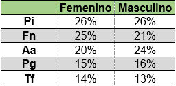 No se detectaron diferencias significativas en la proporción de microorganismos al considerar el sexo con un nivel de significación de 0.05 utilizando la prueba T para dos muestras suponiendo varianzas iguales (Tabla 4).