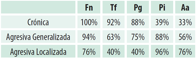 Resultados: En los cuadros crónicos destacó F. nucleatum, T. forsythia y P.gingivalis. En los agresivos F. nucleatum y P. intermedia, y dentro de éstos en los generalizados una mayor proporción de P. gingivalis y T. forsythia y de A. actinomycetemcomitans en los localizados.