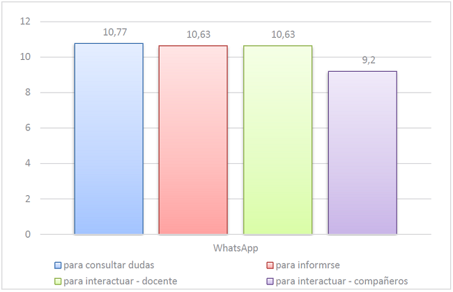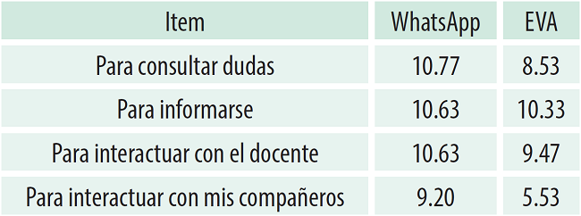 A diferencia de lo que sucede en EVA, en el grupo de estudiantes relevados se vio que este si es un medio de comunicación utilizado entre estudiantes donde califican a WhatsApp con 9.2/12 y a EVA con un 5.53/12 en promedio; esta característica es coincidente con lo planteado por Villadiego Cabrera MR14.