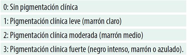 La pigmentación fisiológica suele ser simétrica, persistente y no altera la arquitectura normal de la encía. Suele ser más común en mujeres que en varones 11. Dummet 12 plantea una clasificación del color de la melanosis: castaño claro, castaño mediano y castaño profundo.
