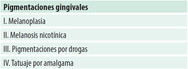 La melanosis gingival puede presentarse de forma triangular/lineal o difusa con variaciones del color que van del marrón oscuro, el negro y el marrón claro. En el 2017 la Academia Americana de Periodontología y la Federación Europea de Periodontología modificaron la clasificación de las Enfermedades Periodontales de 1999 y plantean una nueva Clasificación de Enfermedades Periodontales y Periimplantares 14 según la cual las anomalías del color de la encía se diagnostican como “pigmentaciones gingivales” (Tabla 2)