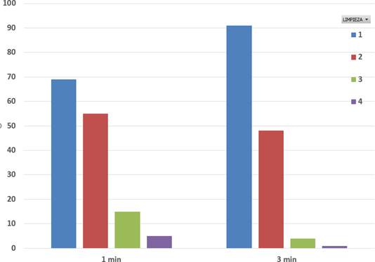 El tiempo demostró ser una variable dependiente con respecto a la limpieza (p= 0,00576) (Gráfico 1). Se ensayó un modelo multivariado de regresión logística binaria con la variable limpieza como variable dependiente y la edad, el tiempo, el tercio y el irrigante como independientes. El modelo ajustó (Hosmer and Lemeshow Test, p= 0,601) y mostró que la edad, el tiempo y el tercio del conducto, son significativamente dependientes. A mayor tiempo mayor limpieza, a mayor edad mayor presencia de barro dentinario y cuanto más apical menor limpieza. El irrigante no apareció como significativamente dependiente.
