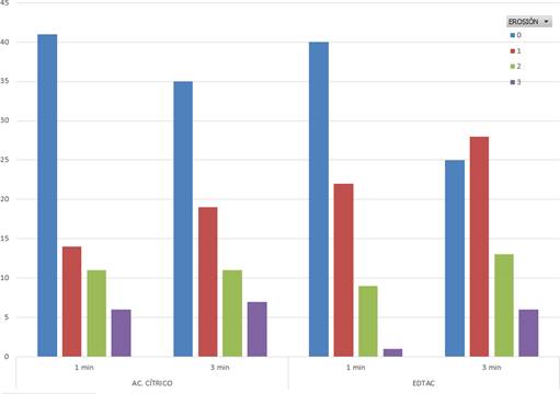 Turk, Kaval and Sen 2015, a pesar de utilizar EDTA y ácido cítrico por 1 minuto, en concentraciones más bajas que las de esta investigación, 5% y 2,5% respectivamente, igualmente encontraron erosiones 27 .