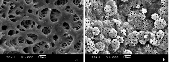 En algunas microfotografías se observaron zonas del conducto vírgenes, sin instrumentar. La presencia de la predentina no eliminada muestra una imagen semejante a la de los túbulos dentinarios con gran erosión, de luz amplia, con conductillos interconectados (Fig. 3 a). Estos hallazgos coinciden con otras