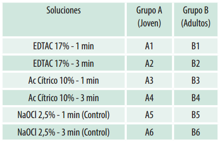 Cada subgrupo de 60 raíces de jóvenes (A) y de adultos (B) fue dividido al azar en 6 grupos: 4 grupos de 12 dientes y 2 grupos control de 6 dientes cada uno (Tabla 1).