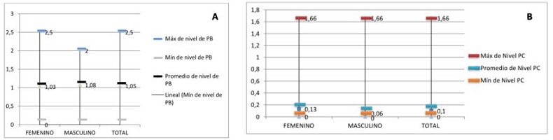 El nivel de placa blanda presente en los escolares mostró un promedio de 1,03 para el sexo femenino y 1,08 para el sexo masculino, el nivel de placa calcificada presente indicó un promedio de 0,06 y 0,13 para el sexo masculino y femenino respectivamente (Fig. 1).
