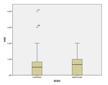 El índice de higiene oral simplificado mostró que los escolares evaluados tienen una higiene oral buena en promedio (valor 0,63), sin embargo, se observaron escolares que escapan de lo mencionado con un índice de higiene oral regular en el sexo masculino con un valor máximo de 2 y en el sexo femenino un índice de higiene oral mala con un valor máximo de 4 (tabla 1). Entre ambos sexos se observa que en media no existe una diferencia significativa en el índice de higiene oral, aunque se muestra que en el sexo femenino si se presenta algunos escolares con una higiene oral mala (Fig. 2).