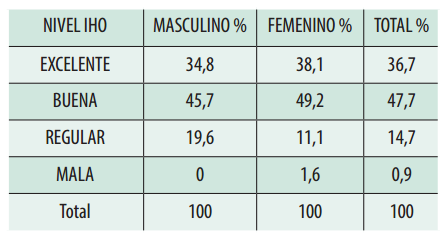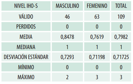 Resultados: De los 109 escolares de 12 años encuestados se observó un ligero predominio del sexo femenino (58%) sobre el sexo masculino (42%). Además, se determinó que el 47,7% presenta una buena higiene oral, el 36,7% una higiene oral excelente, el 14,7% una higiene oral regular y el 0,9% una mala higiene oral, dando como resultado que más de la mitad de los escolares presentan un IHO bueno y excelente.