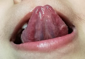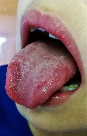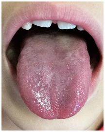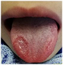 Al examen clínico del órgano lingual se observaron, lesiones de elementos múltiples en forma de anillos incompletos en la cara dorsal (punta de la lengua y zonas laterales), extendiéndose a la cara ventral, con áreas de desqueratinización y descamación de las papilas filiformes. Las zonas descamadas son rojas, tienen poca sensibilidad, bordes gruesos y de color blanco o blanco amarillento.