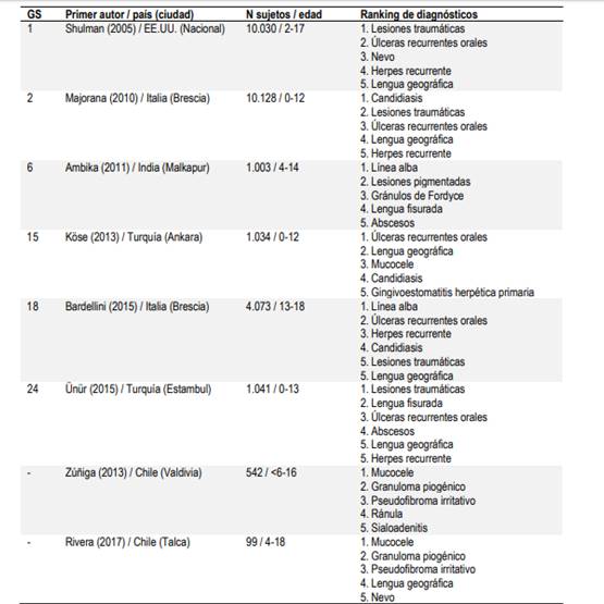 Según César Rivera (2017) quien reporta mediante una revisión sistemática de la literatura las lesiones de lengua geográfica se encuentran dentro de las 5 patologías más frecuentes de la mucosa oral en niños y adolescentes. Los estudios fueron realizados en Estados Unidos, Italia, India, Turquía y Chile (Tabla 1). El rango de las muestras de la revisión sistemática va de 10.030 a 1.041 sujetos, con un rango etario de 0 a 18 años. 22