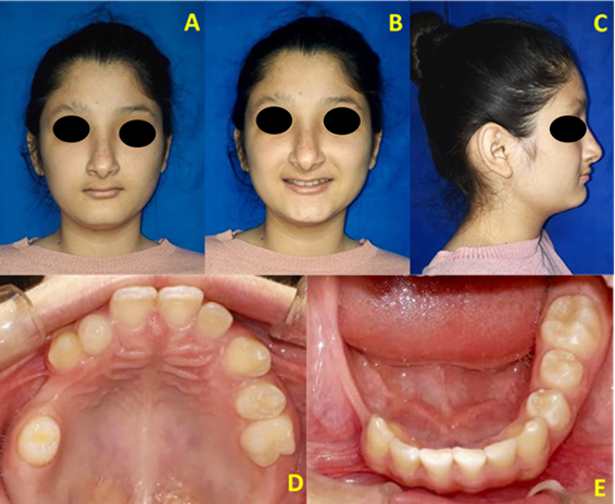Mediante la historia clínica, se conoció que, debido al entrecruzamiento anterior, se le realizó un tratamiento ortopédico con una placa Hawley con tornillo de expansión y ganchos vestibulares para la retracción maxilar (Fig. 1A y 1B), como consecuencia se generó un descruce anterior y se ganó perímetro de arco para la erupción de las piezas permanentes. Además, en el año 2011, se le realizó una prótesis parcial removible provisional para devolver la funcionalidad y estética de la paciente. Actualmente, la paciente acude para el recambio de la prótesis.