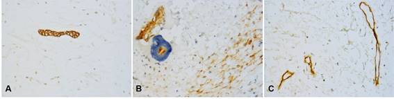Para determinar la MDV, se empleó el método descrito por Weidner et al. Los tejidos fueron visualizados inicialmente bajo un objetivo de 10x, para identificar 3 zonas con la mayor concentración de vasos positivos (hot spots), en las cuales, bajo el objetivo de 40x se realizó el contaje de vasos manualmente. Finalmente se calculó la media del número de vasos en los cinco campos de cada muestra 8.