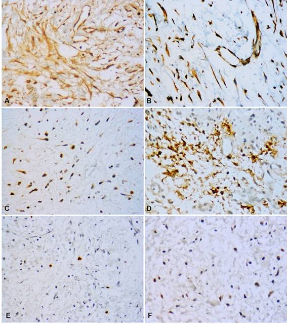 Las reacciones fueron consideradas positivas al observar marcación marrón celular (células tumorales, endoteliales o de islas de epitelio odontogénico), o en la matriz extracelular (MEC). Los patrones de marcación (nuclear, citoplasmática, membranosa o de MEC) varían con cada tipo de anticuerpo.