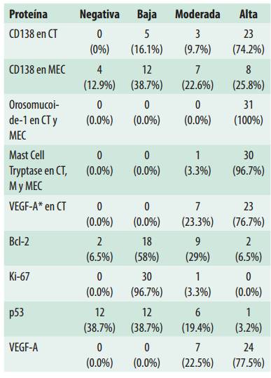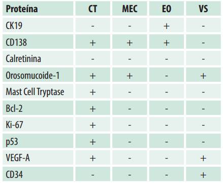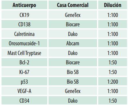 Proteínas evaluadas en células tumorales y matriz extracelular: CD138, Calretinina, Orosomucoide-1, Mast Cell Tryptase, Bcl-2, Ki-67, p53 y VEGF-A.