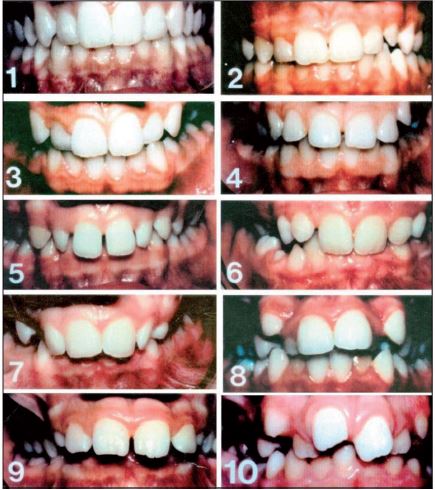 El presente estudio fue descriptivo de corte transversal, aprobado por el comité de bioética de la Universidad Andina del Cusco. La muestra estuvo constituida por 142 niños de 11 a 12 años de ambos sexos de la Institución Educativa Mariscal Gamarra, quienes reunieron los criterios de selección, el más importante que los padres hayan firmado el consentimiento informado mediante el cual se autoriza la participación del menor en la investigación, así como la participación voluntaria del escolar. A todos se les aplicó el instrumento denominado índice de Necesidad de Tratamiento de Ortodoncia (INTO). El componente estético (CE), que es de carácter subjetivo consistente en una escala análoga visual compuesta por una serie de 10 fotografías intraorales frontales que se corresponden a 10 posibles niveles estéticos dentales. Es importante aclarar que las fotografías corresponden a niños de 12 años con dentición permanente (Figura 1). La fotografía N° 1 se presenta con las características más atractivas y la fotografía N° 10 se presenta con las características menos atractivas. Este componente fue evaluado por el paciente, según su percepción, reflejando así la necesidad de tratamiento desde el punto de vista social, psicológico del tratamiento de ortodoncia. Se le pidió al niño que identifique la foto de acuerdo a la percepción de su estética dental. Si la foto que elegía se encontrara entre la 1 y la 4, se consideró sin necesidad de tratamiento; entre la 5 y 7, con necesidad moderada de tratamiento; y entre la 8 y 10, con necesidad urgente de tratamiento 5,8,9.