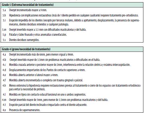 Para el componente de salud oral se realizó un examen clínico en un ambiente adecuado. Se usó la ayuda de una regla milimetrada, se identificó el rasgo más severo al examinar al paciente. Se atribuyó el rasgo más severo para la clasificación del paciente según la necesidad de tratamiento desde el punto de vista objetivo del examinador (Tabla 1). Se observaron las características de los siguientes rasgos oclusales: overjet, overbite, mordida abierta, mordida cruzada, erupción impedida, defectos de labio leporino y paladar hendido, anomalías craneofaciales, erupción impedida e hipodoncia. El rasgo oclusal más alterado se utilizó para categorizar la necesidad de tratamiento de ortodoncia desde: sin necesidad de tratamiento (grado 1 y 2), necesidad moderada (grado 3) y con necesidad de tratamiento (grado 4 y 5) 5,8,9.