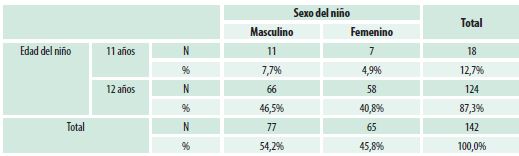 De la muestra de 142 niños el 12,7% fueron niños de 11 años y el 87,3% de 12 años. Con respecto al sexo el 54,2% fueron niños y el 45,8% niñas (Tabla 2).