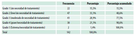Con respecto al Componente de Salud Dental el grado de necesidad de tratamiento de ortodoncia fue de 15,5% grado 1, sin necesidad. El 33,1% fue identificado como grado 2, leve necesidad de tratamiento. El 28,9% fue identificado como grado 3, moderada necesidad de tratamiento. Es decir el 77,5% de los evaluados se encontraron dentro del límite de necesidad de tratamiento, el resto mostro grave y extrema necesidad de tratamiento de Ortodoncia (Tabla 3).