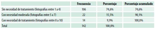 Results: According to the results, 15.49% did not need any treatment, 33.10% had a slight need for treatment, and 28.87% a moderate need for treatment in the Dental Health component; 74.65% presented no need for treatment in the Aesthetic Component.