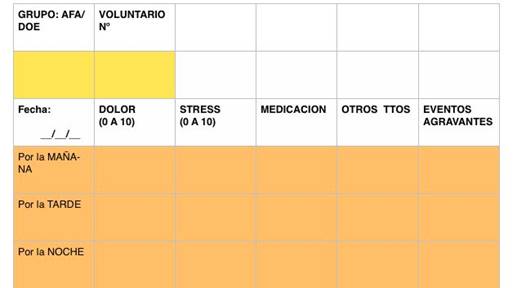 Para la evaluación de las variables dolor y estrés emocional, el instrumento de medición fue la escala verbal análoga (EVA). Para la recolección de datos se utilizó una encuesta que incluye el instrumento de medición mencionado (Fig. 1). Ésta fue utilizada en repetidas oportunidades, desde el inicio hasta el final de las intervenciones, con la finalidad de evaluar la evolución del síntoma relatado por el paciente. Cada uno de los grupos de tratamiento estuvo compuesto de siete individuos, los cuales fueron evaluados durante ocho (AFA) y seis (DOE) semanas, más una evaluación previa para determinar valores promedio al inicio del tratamiento. En cada una de las evaluaciones se registraron autoreportes de dolor y stress en tres momentos del día: mañana, tarde y noche. Para la evaluación previa se les proveyó de un diario del dolor dos semanas antes de la intervención, de manera de obtener un dato promedio de dolor de base, esto se realiza considerando las características del mismo y sus fluctuaciones.