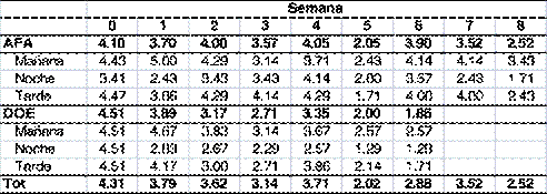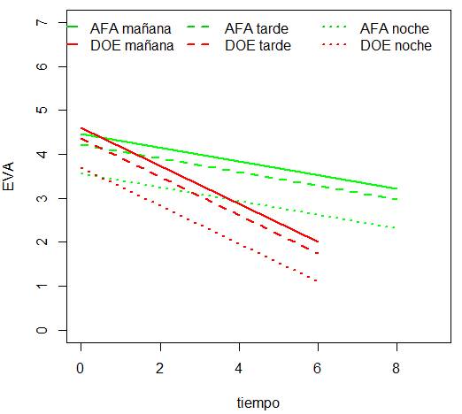 En el presente gráfico se puede observar que el descenso del tratamiento con DOE (líneas rojas) es más pronunciado que en las intervenciones con AFA (líneas verdes). Las tres líneas, correspondientes a cada tratamiento, responden a la evolución en los tres momentos del día, observándose que los valores de dolor en las noches son menores a los registrados en la mañana y tarde.