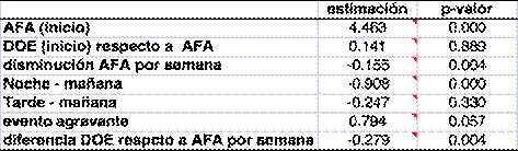 De la lectura de las dos primeras líneas del cuadro 2 se puede apreciar cómo el valor medio de dolor de ambos grupos no fue significativamente distinto, siendo el promedio 4.463 puntos. La tercera línea presenta el primer resultado relevante, el cual indica que el tratamiento AFA se caracterizó por un descenso semanal significativo de 0.155 puntos en la medición del dolor. Complementando la afirmación anterior, la última fila muestra que en el caso del tratamiento con DOE, la tendencia fue aún más pronunciada que en el tratamiento con AFA, siendo esta diferencia significativa. Al combinar ambas estimaciones se obtiene que el descenso en la medición del dolor del grupo DOE fuera casi medio punto (0.434) por semana.