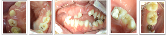 Al examen clínico de la cavidad bucal (Figs. 2,3,4,5 y 6), no se observaron lesiones en las mucosas, se identificaron atresia de la arcada dentaria superior con mordida cruzada unilateral en el lado derecho y mordida abierta anterior. Además, presencia generalizada de biopelicula microbiana sobre las superfícies dentales y sangrado gingival, un remanente radicular del diente 74, una restauración provisoria en mal estado en las caras oclusal y lingual del diente 85, así como lesiones microcavitadas activas de Caries dental en la cara oclusal de los dientes 26, 65 y 75.