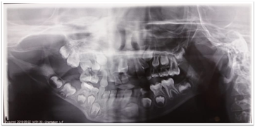 En relación al examen radiográfico, la radiografía panorámica (Figura 7) mostró una importante alteración en la rama mandibular derecha en forma de racimo y un alargamiento del canal mandibular del mismo lado. También se observaron algunos retrasos en la erupción dentaria que requerían acompañamiento.