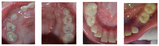 A partir de los exámenes realizados y el contacto con el equipo médico, se planearon cinco citas para procedimientos odontológicos en ambiente ambulatorio. En la primera consulta se realizó la exodoncia del remanente del diente 74, bajo anestesia local con lidocaína 2% asociada a epinefrina 1:100000. En la segunda consulta, se inició el tratamiento pulpar (preparación químico mecánica de los canales radiculares y medicación intracanal con pasta de hidróxido de calcio) del diente 85. En la tercera consulta, se obturaron los canales radiculares del diente 85 con pasta de hidróxido de cálcio, óxido de zinc y propilenoglicol y se selló con ionómero de vidrio autopolimerizable y resina compuesta; bajo aislamiento absoluto y anestesia local. En la cuarta consulta, se aplicaron sellantes resinosos en las caras oclusales de los dientes 26, 65 y 75 bajo aislamiento relativo y se dieron orientaciones de higiene bucal y dieta a la niña y a su abuela. Por último, en la quinta consulta, se reforzaron las orientaciones para la salud bucal. En las figuras 8, 9, 10 y 11 se puede apreciar el aspecto de la cavidad bucal terminado el tratamiento odontológico.