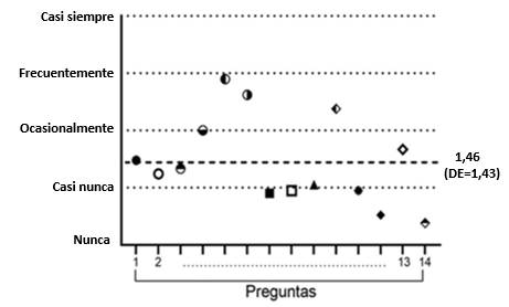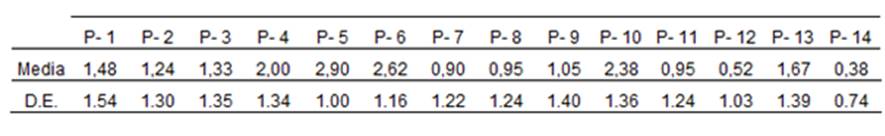 En cuanto a la calidad de vida, el cuestionario OHIP-14 brindó la siguiente información: los participantes presentaron un nivel de afectación en la calidad de vida de 1,46 (desvío estándar de 1,43) en promedio (Figura 1), siendo la puntuación mínima de 0,38 y la máxima de 2,90 (Tabla 2). La escala va de 0 al 4, donde 4 es la máxima afectación, significando que existe afectación en la calidad de vida de los pacientes con enfermedad periodontal.