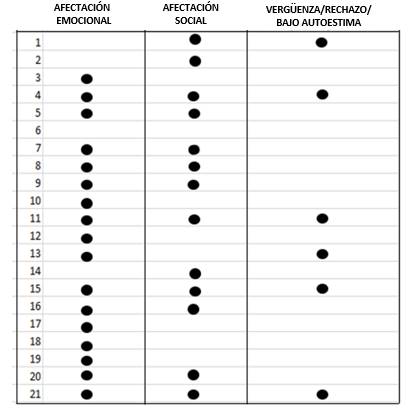 La afectación emocional tuvo una frecuencia del 81% en las respuestas dadas por los participantes. Por otro lado, la repercusión a nivel social se expresa con una frecuencia del 62% en las respuestas y los sentimientos de vergüenza, rechazo y/o baja autoestima son mencionados en un 28,5%. (Tabla 1)