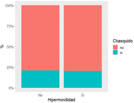 El objetivo del estudio fue analizar si la hiperlaxitud articular generalizada (HAG) es un factor de riesgo para los trastornos de la articulación temporomandibular (ATM). Para ello se evaluó la posible asociación entre chasquido de la ATM y el diagnóstico de HAG. Se trabajó con la siguiente hipótesis: el paciente con HAG, tendría mayor prevalencia de chasquido a nivel de la ATM que los que no la presentan, constituyendo la HAG un factor de riesgo para padecer un desorden articular (DA).